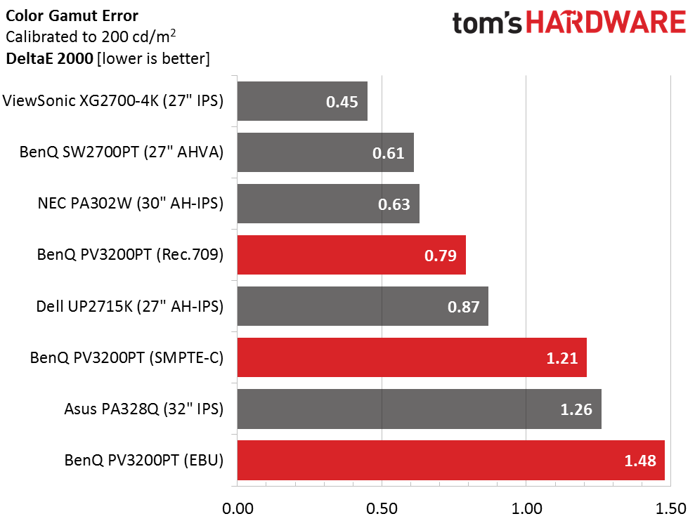 Here are the average error results for all three gamuts. Rec.709 is exemplary with SMPT-C and EBU not too far behind. For ultimate precision, a calibration will be necessary but in most cases, the monitor is just fine without adjustment.