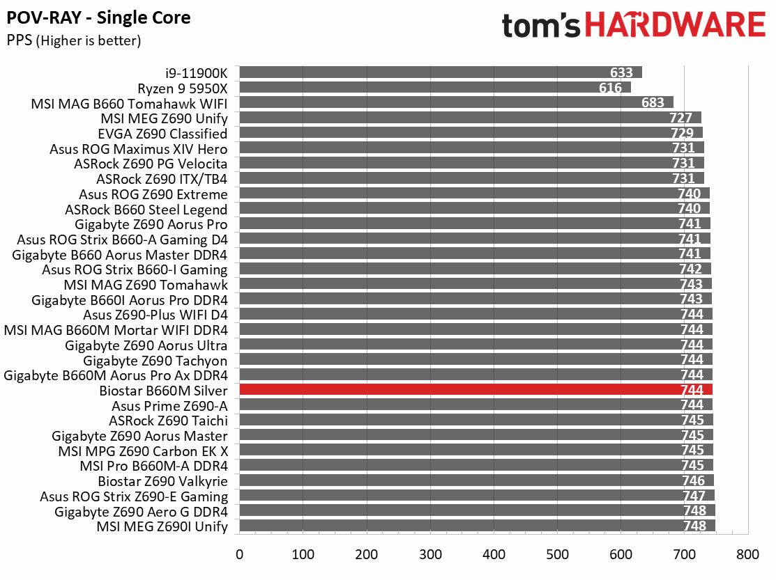 The B660M Silver performed well during most synthetic benchmarks, landing around the average of other DDR4-equipped motherboards. The only below-average tests were Cinebench R23 and POV-Ray’s multi-threaded tests. But if you’ve read our previous reviews, you know that’s a recurring theme due to the thermal throttling of the processor. The Procyon tests were all averag, as was the AIDA64 memory bandwidth.
