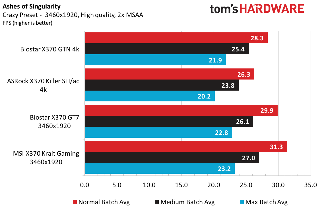 Standard 4K Ashes performs as expected compared to the slightly less demanding Nvidia Surround resolution of 3460x1920, and the Crazy preset shows a lowly 1 FPS decrease against the triple monitor setup.
