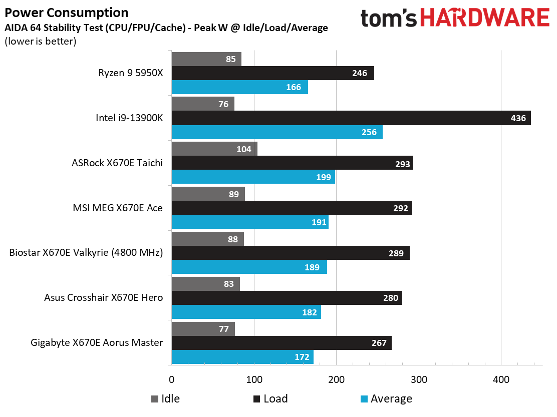 Power consumption on the X670E Valkyrie was middle of the pack. It averaged 88 Watts at idle and peaked at 289W during a stress-test load. Nothing to be concerned with here.