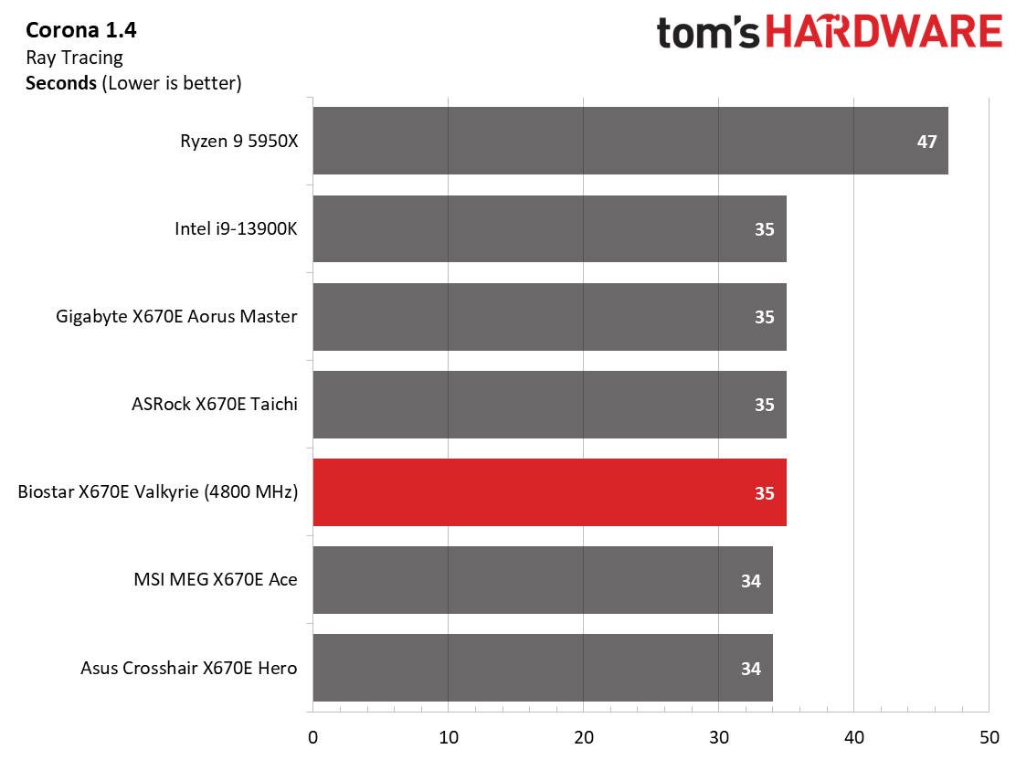 When looking at our timed applications, the LAME and Corona results were good, with above-average and average results, respectively. Handbrake results were slightly slower than the average, matching the Crosshair X670E Hero. There’s nothing abnormal about the timed benchmarks.