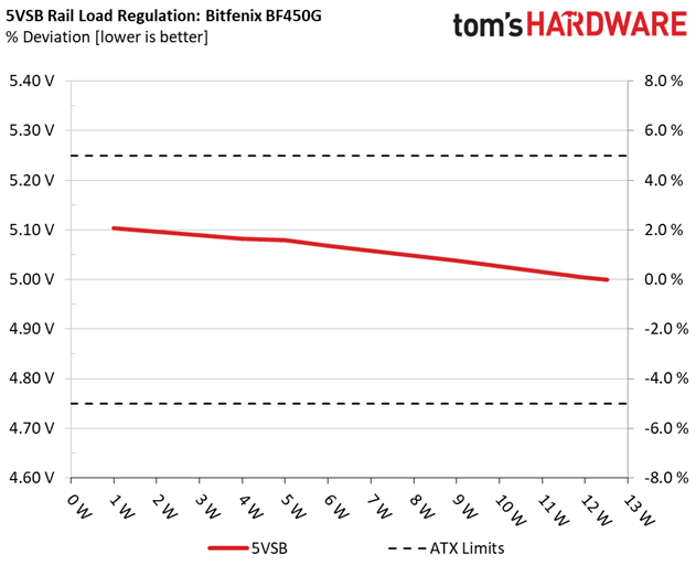 Load regulation on all of the rails was tight, and we like that this PSU features quiet operation even under the taxing conditions of our test bench. It took cranking the load up to 110% of the BF450G's maximum-rated capacity and dialing the temperature beyond 46°C to make this PSU's fan spin at full speed. Even then, noise output remained under 40 dB(A). Although we ran our tests at grueling ambient temperatures, BitFenix's BF450G showed that it deserves its 80 PLUS Gold certification.