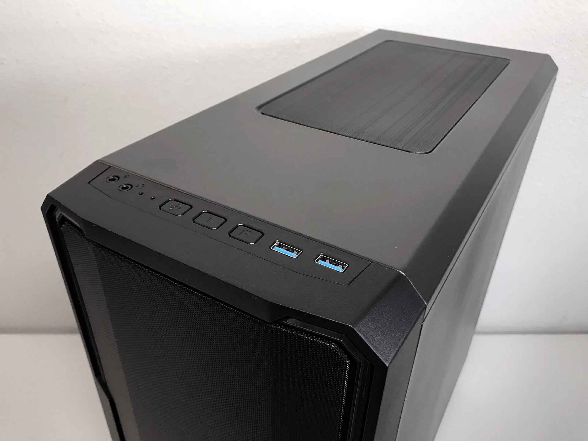 The leading edge of the top panel is home to two USB 3.0 ports, an LED controller, headphone and microphone jacks, a hard drive activity LED, and a reset and power button. Directly behind the mesh front fascia you'll find mounting locations for two 120mm intake fans.
