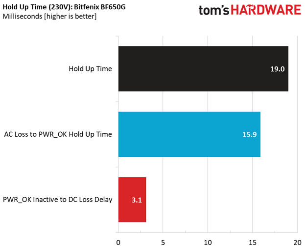 The hold-up time we measure is longer than 17ms, while the power-good signal is accurate and only a hair away from 16ms.