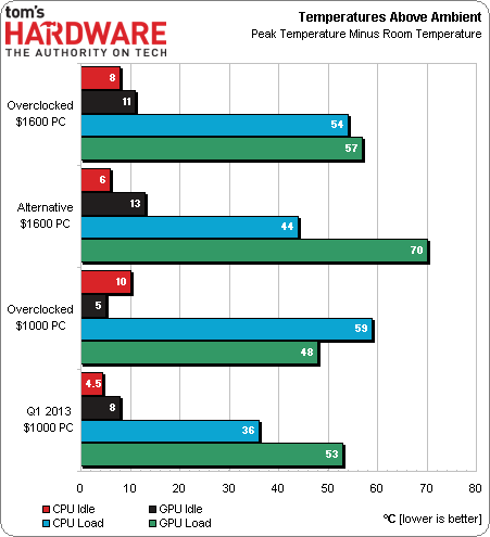 Non-overclocked CPU temperature differences are far larger, though that’s the fault of a 90°-max fan slope. A low 18° ambient temp produces the big 70° delta.
