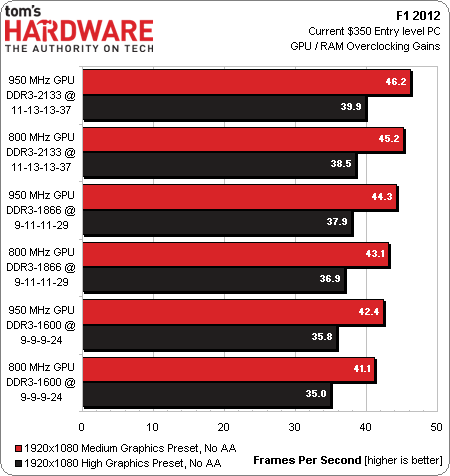 Memory frequency plays a big role in how well an APU handles F1 2012 (far more so than bolstered GPU clocks). Even at relaxed timings, running DDR3-2133 allows 2 FPS more than our previously-tested overclock. Fully tweaked, we should be able to play this title at 1920x1080 at the High detail preset.