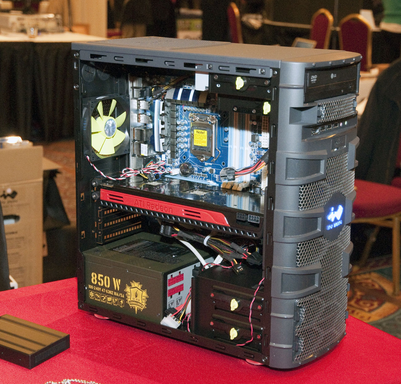 We also came across In Win, notable mostly for its mainstream PC cases. But the company is branching out into enthusiast territory. Representatives of the company were showing off a couple of power supplies, one 1,200W and an 850W unit, at the CES Unveiled press event. The company also demonstrated an interesting microATX mini-tower with enough cooling for performance geeks, and actually deep enough for big graphics cards (note the Radeon HD 5970 in the photo; that card is a foot long).