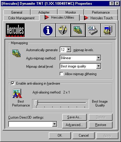 The Dynamite TNT is next to the V3400TNT the second TNT card with an active cooler, that does a pretty good job as you can see in the heat comparison. Hercules is courageous enough to team this small and well designed card up with a set of drivers that overclock the Dynamite to 98/125 MHz by default. This makes the Dynamite faster than all the others right after you've installed it. The memory and the card layout seem to be very good, because only the Asus card is also able to run the memory as fast as the Hercules card, all others fail at 125 MHz. The Dynamite does not include a video out, but if you look at the board you will find that the layout is ready for it, so that I expect a Dynamite TNT with video out sometimes soon as well. The drivers set is one of the best, and it's the only one that offers you a full overclocking tool by default. I have got three Dynamite TNT boards to make sure that the quality and stability of this product is not only found in one specially prepared 'reviewers board'. All boards are running rock stable at the 98/125 MHz, one of them even at 115/125 MHz, the other two go up to 110/125 MHz.