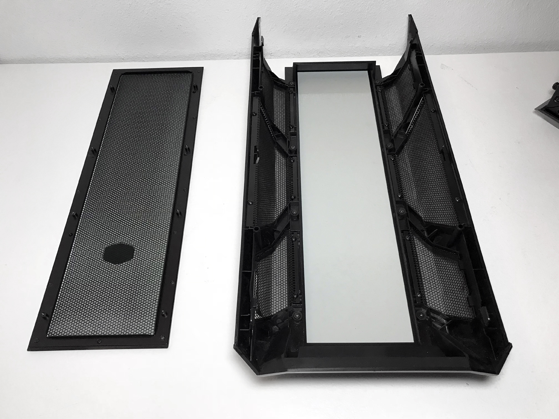 In its default configuration the front fascia ships with a center panel made of the same dual-layer black metal mesh material embedded in the front and top panels. Cooler Master includes an optional tempered glass front panel for this chassis as well. Changing the center insert requires the removal of eight Phillips head screws and is a rather straightforward process. We conducted separate thermal and audio tests with each panel installed (page three).