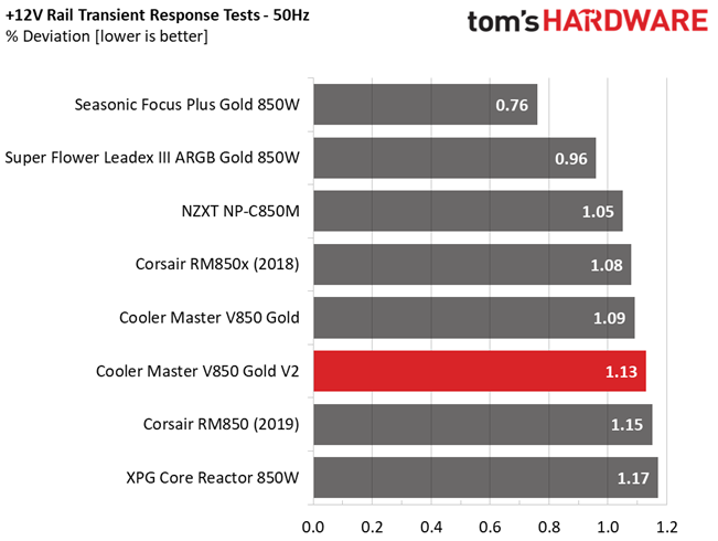 The transient response at 12V is satisfactory, and the same goes for 5V and 5VSB. The PSU passes all tests at 3.3V, but we don't want to see voltages drop below 3.2V on this rail.