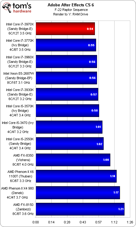 The same story applies to Premiere Pro, which favors the eight-core Xeon, but also runs very fast on the six-core LGA 2011-based chips. Although they’re great for the price, Intel’s Ivy Bridge- and AMD’s Vishera-based processors are more mainstream; they cannot keep up.