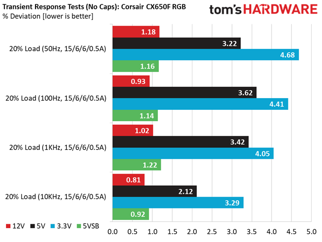 The transient response is pretty good at 12V, which is the most important rail. At 5V is mediocre and the same goes for the 3.3V rail.