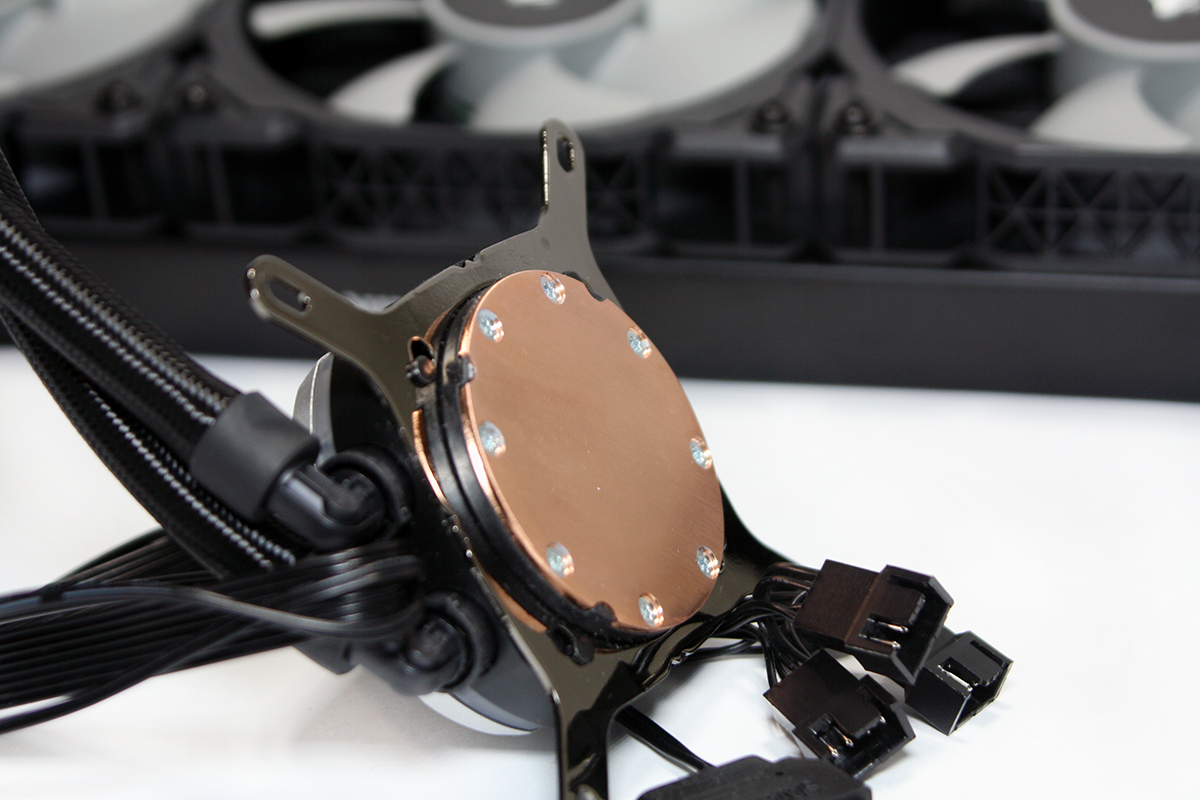 The pump cold plate arrives with a factory-applied splotch of thermal compound, which seemed a bit dry and chalky. The cooler also ships with the Intel mounting plate attached, which happens to also be correct for our overclocked 2011-v3, 6-core i7-5930k. Secured with recessed screws, the copper base is milled very smooth, but not quite to a mirror finish. And while radiator tubing connections are fixed, the pump tubing connections shown above pivot to allow movement during installation.