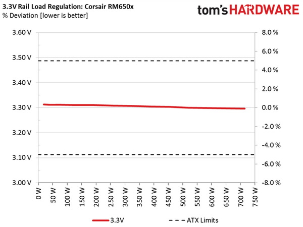 Besides quiet operation, even under extremely tough conditions, the RM650x also features tight load regulation on all of its minor rails. Load regulation is merely satisfactory on the +12V rail though; we'd like to see within 1% deviation, especially since we measured an amazing 0.49% on EVGA's 650 P2. Price-wise, that's a direct opponent.