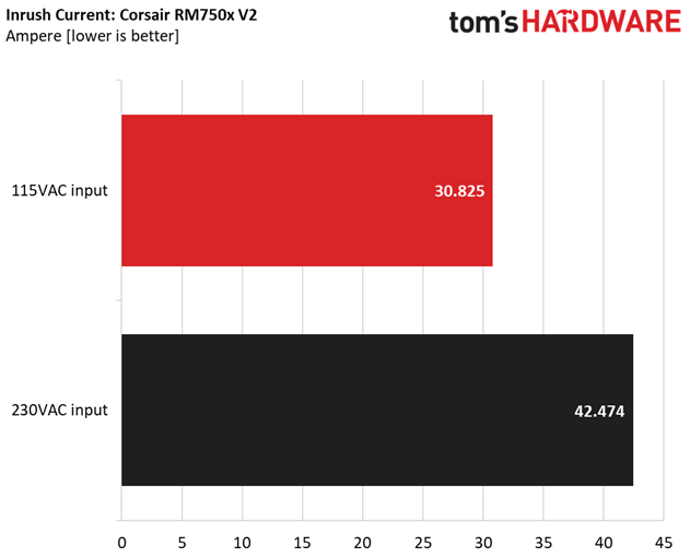 The RM750x satisfied all 80 PLUS Gold requirements, despite the increased temperatures that we applied. At the same time, its fan spun slowly up through the ninth test. Even during our full load and overload tests, the PSU remained quiet. For comparison, the SSR-750FX under full load at 46°C generated 45.2 dB(A), while the RM750x was at 30 dB(A). That difference is huge; for every 3 dB(A), the sound intensity or acoustic power doubles. Meanwhile, the perceived volume (relative loudness) doubles for most of us with every 10 dB(A) increase. To be sure, the RM750x is one of the quietest 750W PSUs available. The best part is that this generalization still applies under highly stressful environmental conditions.