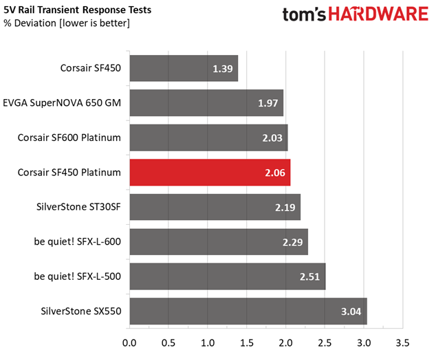 Transient response on the +12V rail doesn't look good. Because this is a low-capacity PSU, it takes quite a hit from the loads that we apply. Performance is much better on the minor rails (especially 3.3V). But the 80 PLUS Gold-rated SF450 posts better benchmark results overall.