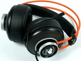 The orange band, matte black cups, and non-functional aluminum highlights made of perforated metal remind us of SteelSeries' Siberia Elite and Roccat's Renga. That may not be a coincidence either, since a lot of the pieces likely come from the same ODM.