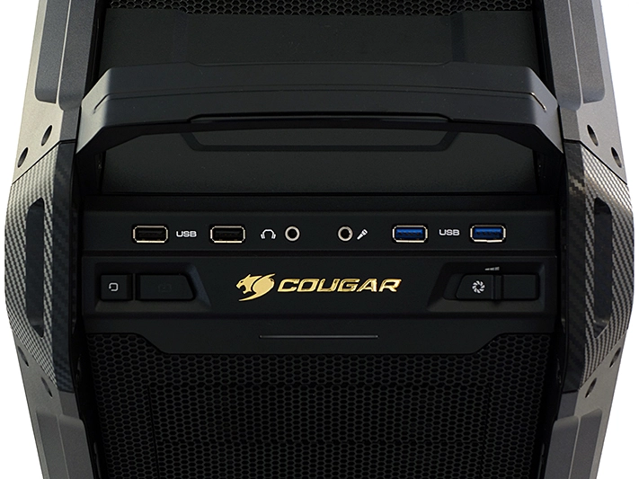 The front panel connector section features two USB 2.0 and two USB 3.0 ports, stereo jacks for your headset, a three-speed fan controller, and the obligatory power and reset buttons. The power LED is hidden within the power button, and the HDD LED flashes at the top of the face beneath a golden Cougar logo. These connectors and switches are angled 45° to ease use for both floor and desk placement.