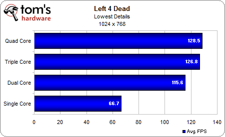 Left 4 Dead demonstrates the same thing Crysis did: game performance maxes out at three CPU cores and drops off slightly to two CPU cores, while a single CPU core takes a big performance hit.