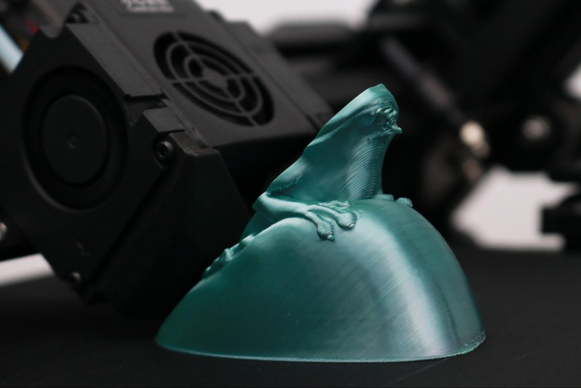 The details on the model are sharp, and the angled layer lines give the print a uniform appearance that doesn't have an immediately intuitive build orientation. The bottom of the print (touching the belt) has a slightly rougher surface finish than the rest of the model, but the other faces all look smooth and even. Some of the models had a slight delamination on the front edge of the part where the initial layer failed to adhere. This isn’t a critical error or a major failure, but a part that starts with a small or otherwise fine feature potentially may not have printed correctly.