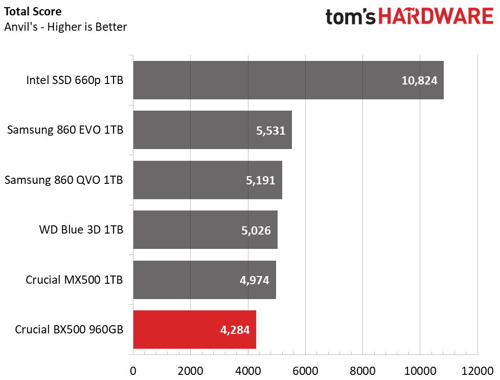 Crucial’s 960GB BX500 delivered low scores across the board in the Anvil benchmark. It achieved a total score of 4,282 points, which ranks in last place.