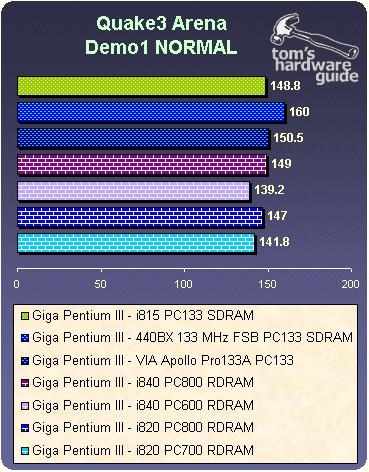 Lot's of us were surprised to see Pentium 4's good results with RDRAM, remembering the sad results Pentium III had produced with the RDRAM-chipsets i820 and i840. The below graphs are taken out of the article about Intel's i815 chipset from June 2000 . They show how much a 1 GHz Pentium III suffers from the RDRAM-platforms i820 and i840.