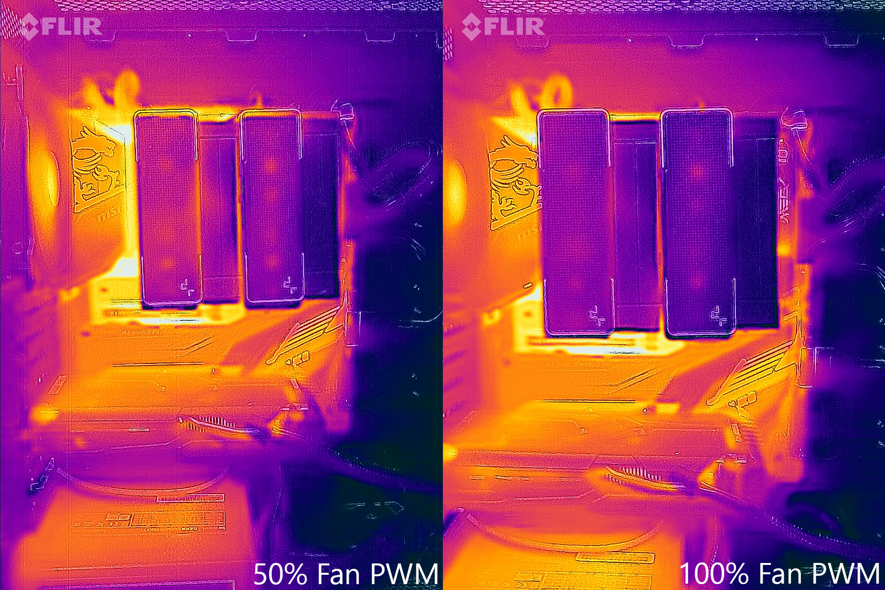 Thermal imaging from our FLIR ONE Pro shows slight differences in heat soak between 50% and 100% fan PWM, although each image sees a consistent spread throughout the cooling tower structures, and smooth cooling paths where airflow is seen moving through the fans and into the fin stacks.