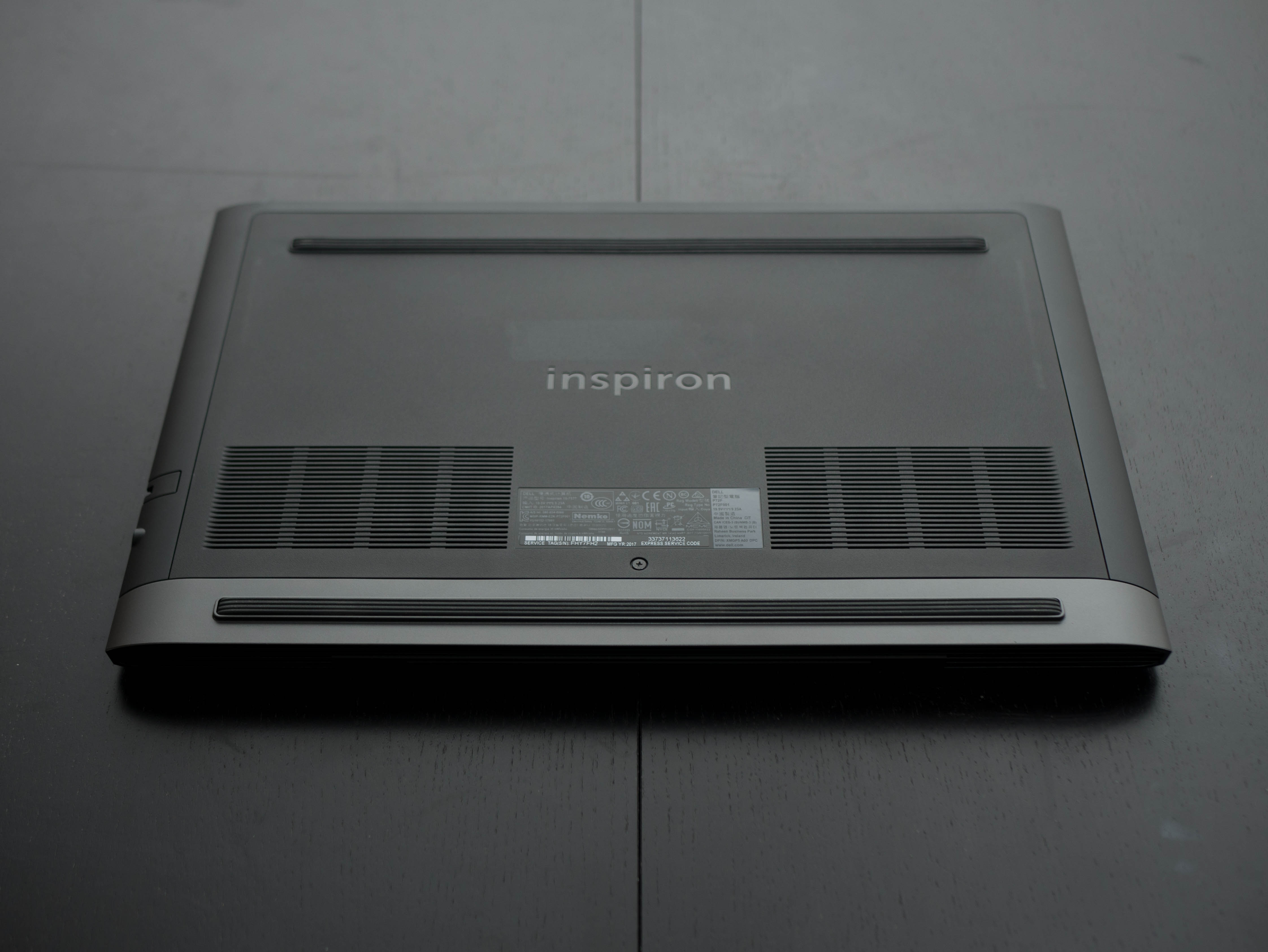 The panel has a straightforward design, with two wide air-intake grilles for the CPU and GPU fans. Two long rubber feet span the length of the bottom panel and on the exhaust shroud at the back. Inspiron branding is engraved in the center of the bottom panel.