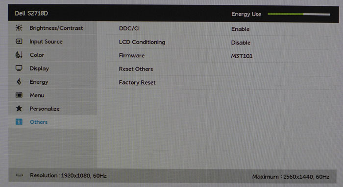 The S2718D’s OSD is much like what you’d see on any Dell monitor. It’s logically laid out and contains plenty of options for the user. HDR is supported by two of the picture presets. For SDR content, you can perform a calibration in the Custom Color mode. No image adjustments are available for HDR content.
