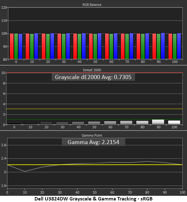 The U3824DW’s gamma tracking is nice and tight, just like all the other screens. All six conform closely to the 2.2 standard as well. This renders the comparison a wash, as these monitors exhibit very similar performance in the gamma tests.