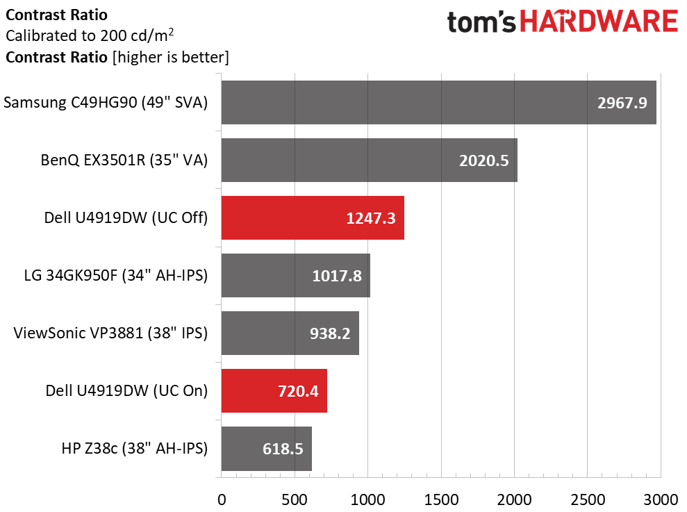 Thanks to some of the best uniformity we’ve ever recorded, the U4919DW posted an excellent ANSI contrast score. It’s very close to the static contrast result, which points to a very high-quality panel with a properly installed grid polarizer and no pressure points on the TFT (thin-film transistor) layer, which could have contributed to glow and bleed.