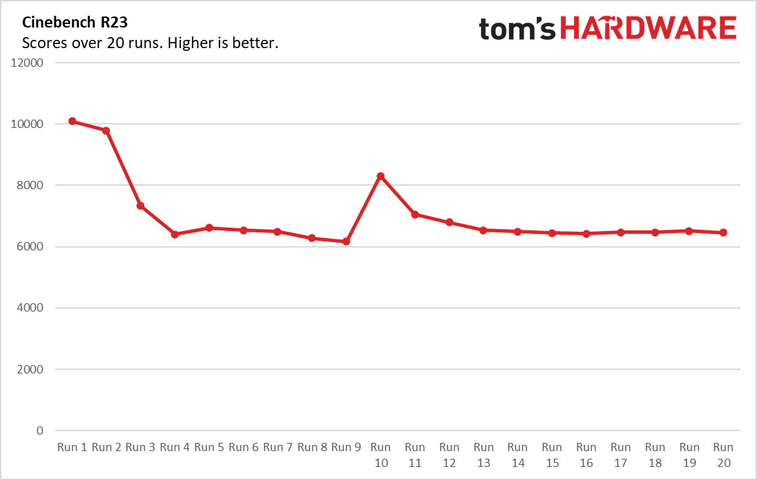 We stress productivity laptops by running the Cinebench R23 CPU stress test 20 times in a row, which usually causes heat soak in the laptop’s cooling system and therefore gives a good baseline for its long-term behavior under load.