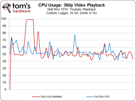 When it comes to battery life, DivX's video engine appears to help here as well. But it's not a complete win. DivX still requires you install Adobe Flash Player, which it relies on to identify the Flash video container before it's passed to the DivX HiQ plug-in. This causes additional processing overhead. Whenever you go to a DivX HiQ-supported Web site, the browser loads the DivX plug-in after Flash. The chart above shows what happens when you open a YouTube video. With DivX HiQ installed, there’s a spike in CPU usage because it's loaded as a secondary plug-in. In practical terms, the amount of battery life you potentially save is very small. In many cases, that processing overhead negates any power savings attributable to DivX Plus Web Player.