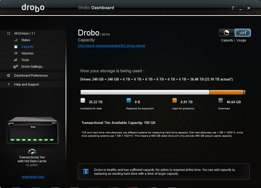 For most systems, we test the software management that comes with the NAS. Users need to log into the system and run a GUI. Drobo products like the B810i use a software utility that runs on both Windows and Mac OS X. The application controls system management, including the iSCSI SAN configuration.