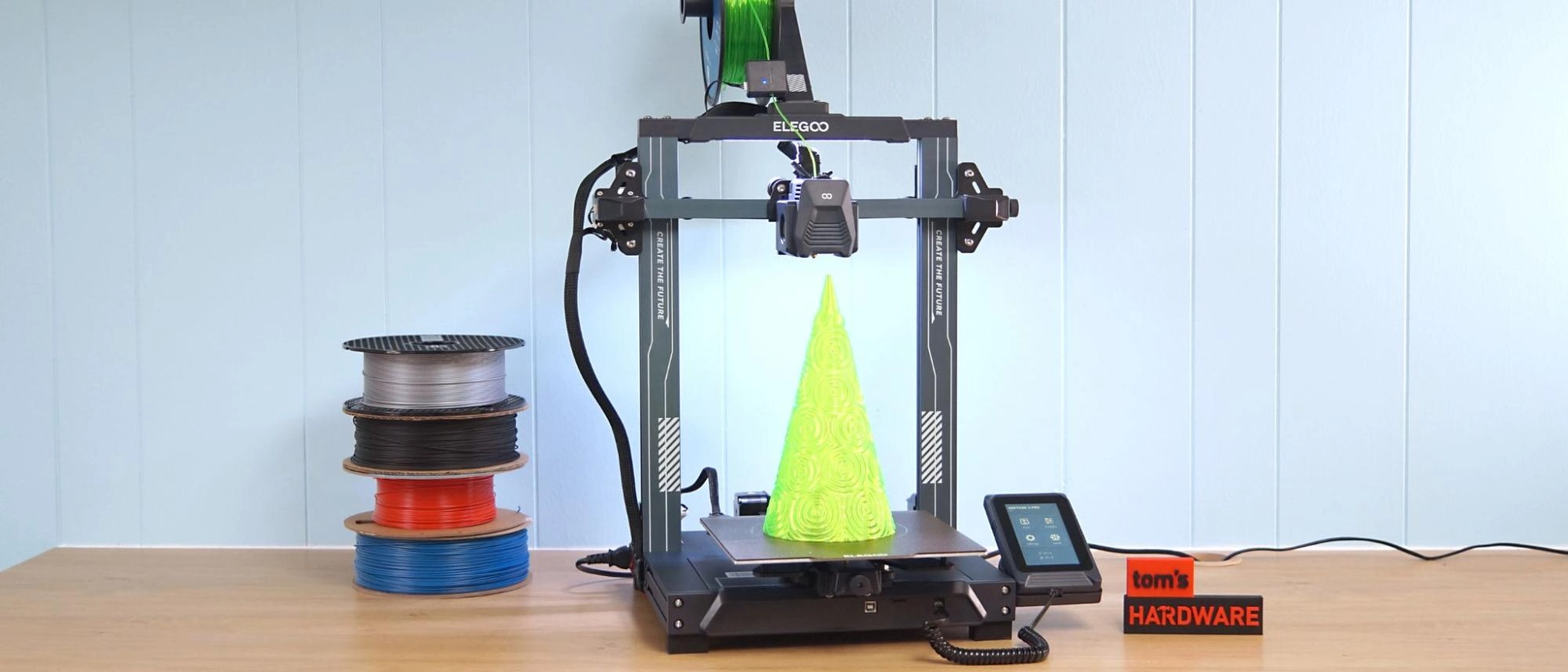 Perhaps Elegoo was listening when we said the old Neptune 3 wasn’t very distinctive, because the new Neptune 3 Pro has become quite the looker. The plain black frame of old has been swapped for gray aluminum with painted stripes and a catchy “Create the Future” motto stamped on the front.