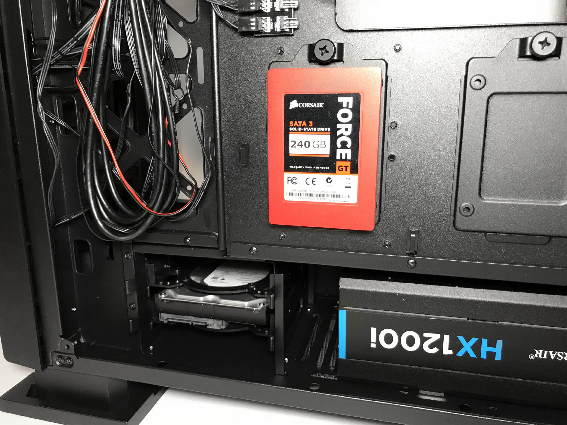 The large, non-removable PSU tunnel at the bottom of the main compartment is home to the power supply and two drive bays. This area, including the hard drive mounting locations, receives airflow from the bottom-most 120mm intake fan.