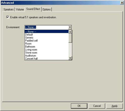The Muse 5.1 DVD software interface is spartan to say the least. Why didn't Hercules copy the interface on the Fortissimo II, a classic of its type? As you can see, it consists of a small gray strip containing the mixers for the outputs and inputs. It is very functional, but lacks the extra refinement to make it comfortable and easy to use, especially as the icons are not always self-explanatory. There is also a button for accessing more advanced choices. Click on it, and four tabs appear, marked Loudspeakers, Volume, Sound Effects, and Options.