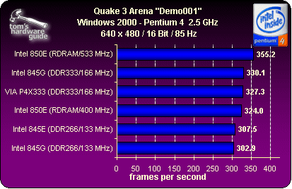 Quake III Arena is dominated by 850E and 845G. This benchmark is still in use because Q3 remains one of the most popular 3D shooters and, more importantly, changes in CPU, memory or graphics performance can immediately be noticed in the benchmark results.