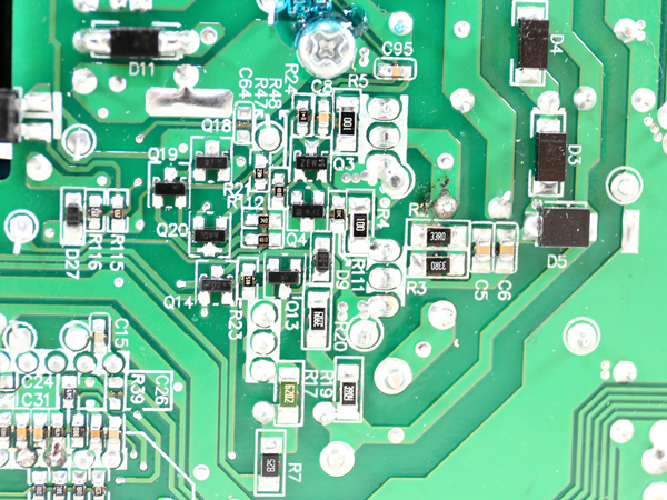 On the solder side of the PCB, aside from the DC-DC converters, we also find some interesting parts, including three shunt resistors under the +12V island. Normally these resistors are used by the OCP circuit. But there's only one +12V rail on this unit, so the shunts aren't exploited.