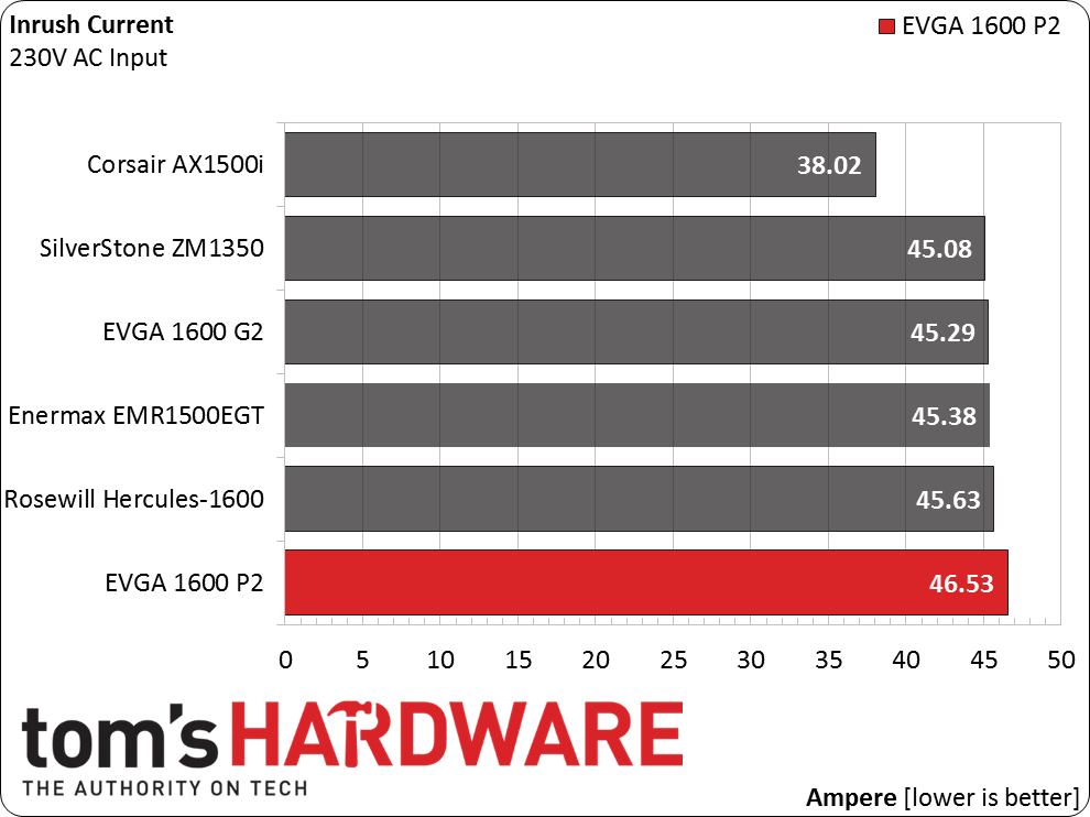 The inrush current of the 1600 P2 with 230V is among the highest we have ever measured. That doesn't place it very far from the rest of the pack, though.
