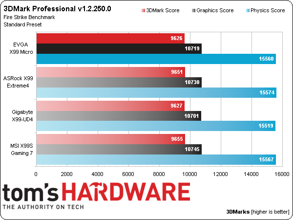 Other than its odd (and strangely repeatable) bump in PCMark’s “Work” score, EVGA’s X99 Micro looks right at home among its full-sized, mid-market rivals.