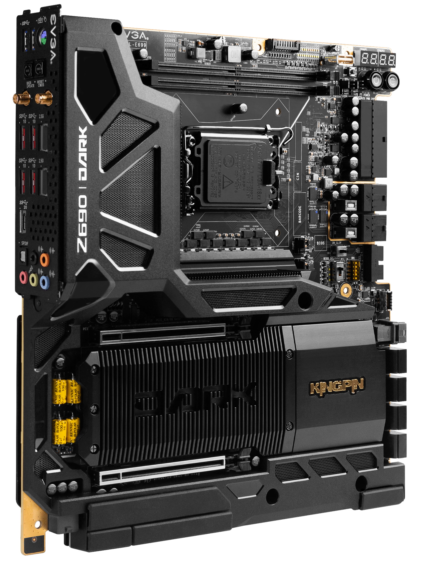 Like it or not–and clearly only the motherboard makers like it–flagship boards these days often push up to or even above the $1,000 mark, all in the quest for the best features and performance. The EVGA Z690 Dark Kingpin (officially stylized K|NGP|N) hit the shelves priced at $849.99 and, as of today, is a more reasonable $699.99. Among flagship moboss, that price is comparitively reasonable when competitors cost between $900 and $1,200. The Z690 Dark has an updated appearance that carries over EVGA’s signature black styling, robust power delivery, horizontal connectors and a unique socket orientation that sets it apart from other boards.