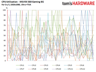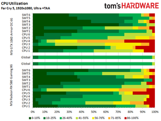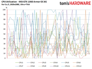 Right out of the gate, it appears that this game is optimized well for multi-core CPUs, even if workloads jump from one core to the next somewhat frequently. Certain cores are saturated with activity, though overall utilization is still fairly low. And, for the first time, we're testing a game that doesn't just prioritize physical cores, but also makes use of the logical ones enabled by AMD's SMT technology.