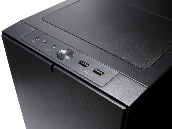 Fractal Design replaced its classic noise-dampened door with a similar-looking solid face panel, above which are two USB 3.0 ports, power and reset buttons, plus headphone and microphone jacks. Removable outer covers behind those ports allow full access to the internal top panel.