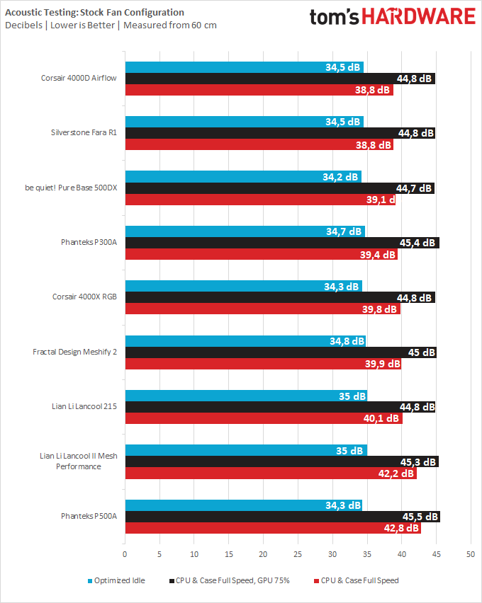 For our acoustic tests, we run three scenarios: CPU full load, CPU and GPU full load, and an optimized idle. The CPU Full Load test runs the CPU and case fans at their maximum speed. For the CPU and GPU full load acoustic test we add the Nvidia RTX 2070 Super FE at 75% fan speed, because in practice it never runs at 100 percent and is far too loud when it does.