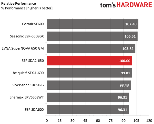 The overall efficiency is high enough, but no match to the performance of both the Corsair SF600 and the EVGA 650 GM.