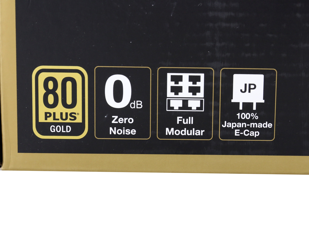 There's a photograph of the PSU on the front of the box showing its changeable stickers. FSP bundles two sets of these so you can alter the supply's look to match your hardware. In the bottom-left corner, a series of icons depict the 80 Plus Gold efficiency, the semi-passive mode, the fully modular cabling and the Japanese electrolytic caps that this unit uses. The capacity description is found in the opposite corner.