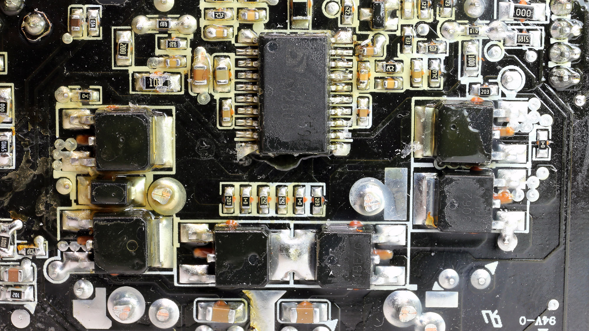 The small PCB is equipped with equally small heat sinks. Except for the transient filter, the other circuits have enough space between electronic parts to allow for decent airflow. It is good to see the filtering caps on the secondary side being on the clear, without anything blocking airflow to them.
