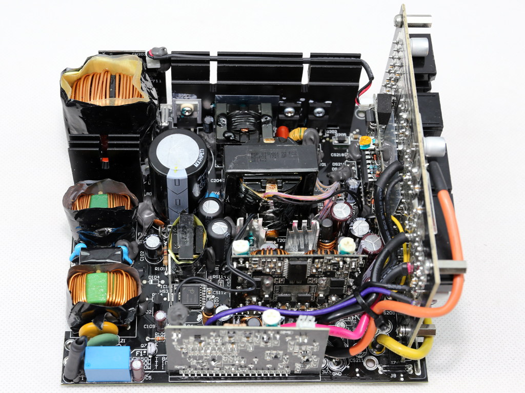 We only find a couple of small heat sinks on the secondary side, since the +12V FETs are mostly cooled by the PSU's chassis. This is a common technique in modern PSUs. It saves space, allowing for a smaller PCB and more filtering caps for better ripple suppression.