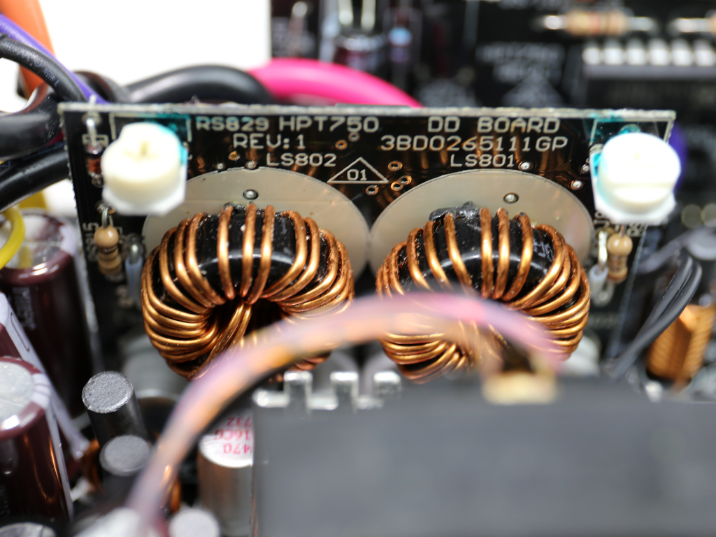 The APFC converter uses three Toshiba TK20A60W FETs and a single CREE C3D06060A boost diode. A pair of bulk caps is provided by Rubycon, and their combined capacity is 660uF. This might look low for a 750W PSU, but the HPT750M still achieves a pretty high hold-up time.